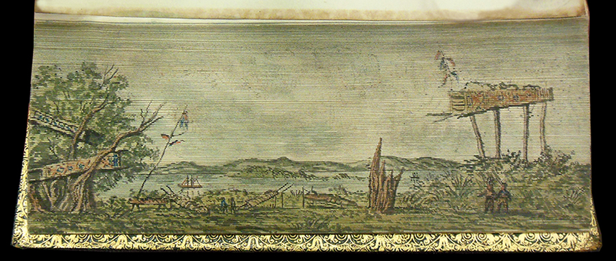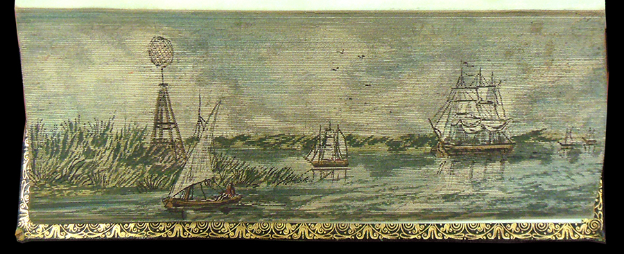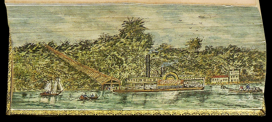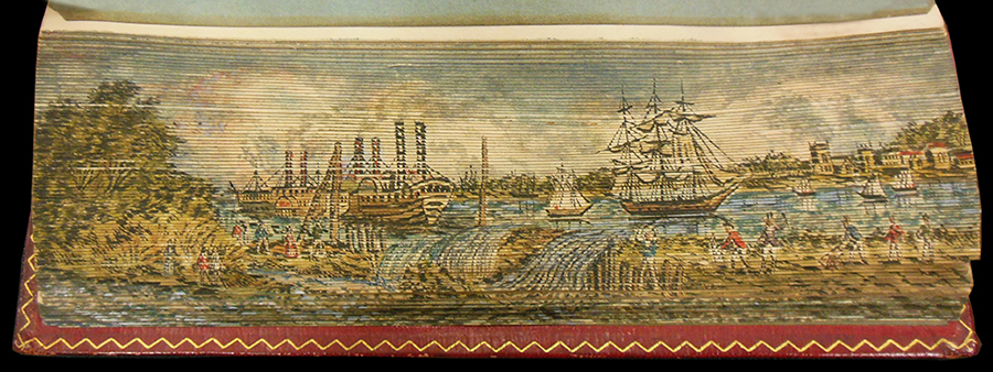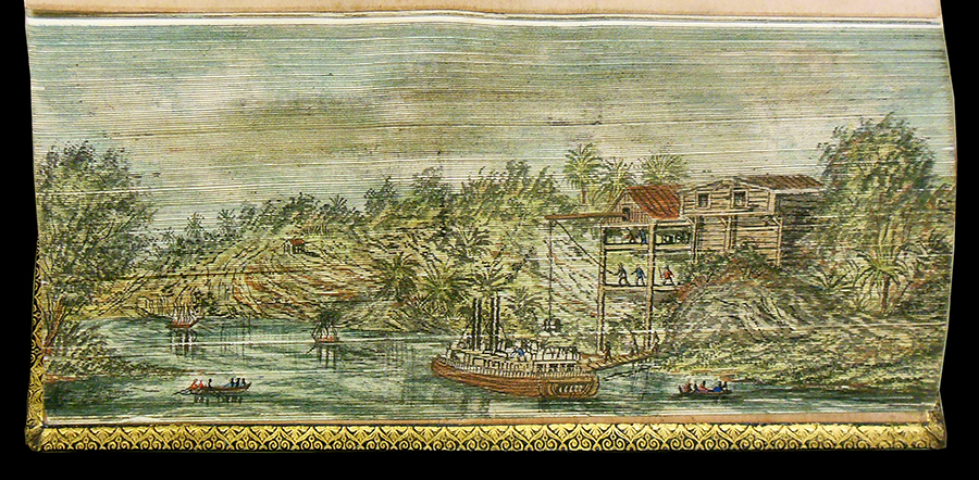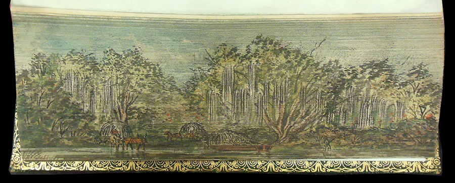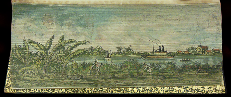 Sir Walter Scott's The Vision of Don Roderick (1811) contains fore-edge paintings showing New Orleans in the mid nineteenth century and a crevasse in a levee along the Misssissippi River. In Thomas Moore's Lallah Rookh (1818), we find views of a cotton shute and a cotton steamer being loaded. Another edition of Lallah Rookh (1854) shows an Indian burial ground and a market garden on the Mississippi. Finally, the library's copy of Thomas Moore's Songs, Ballads, and Sacred Songs (1855) depicts the southwest pass of the Mississippi River delta and moss gatherers in a Louisiana swamp.