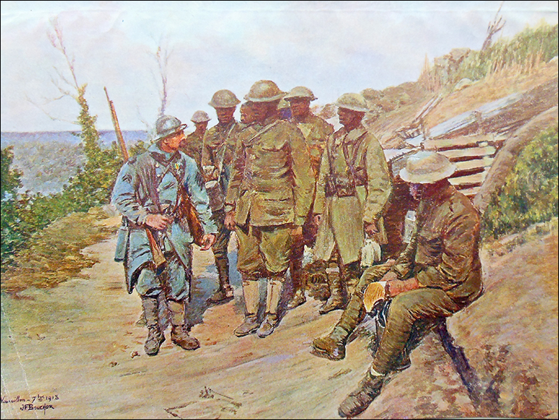 Another example of World War I graphic art in Special Collections is The American Army in France (1920). It contains reproductions of paintings by J. F. Bouchor, official war painter of the French government. Two paintings depict African-American troops, who received a warm welcome in France, as did all Americans. "The presence of American troops with a French organization," one of the image captions reads, "had an impressive effect on their morale. To see their allies in the flesh was much more than reading about them in the newspapers."