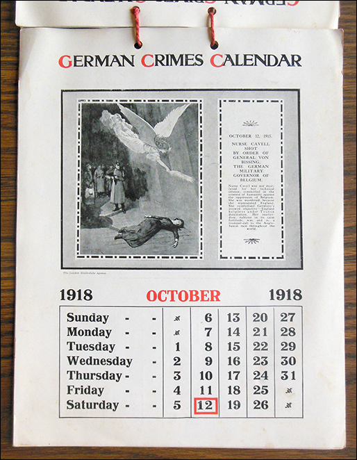 War art was circulated on the home front via many kinds of ephemeral publications, including calendars like the one shown here. Published in 1918 and titled German Crimes Calendar, it contains photographs and paintings depicting horrors such as a Zeppelin air raid on London, the execution of nurse Edith Cavell, the sinking of the Lusitania, the destruction of the city of Louvain, and the Armenian genocide.