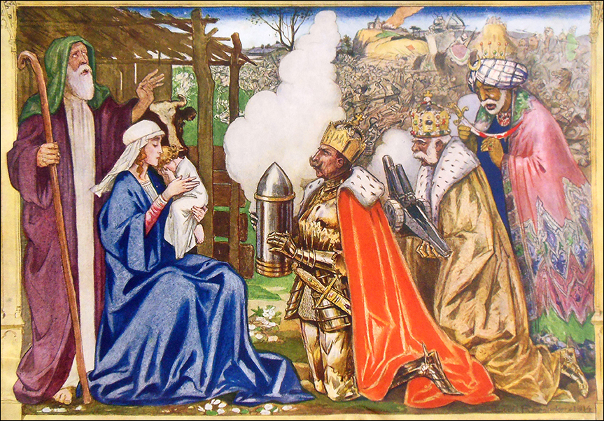 Several images have a medieval aesthetic. For example, one picture, shown below, portrays Kaiser Wilhelm, Austrian Emperor Franz Joseph, and Ottoman Sultan Mehmed as the Three Wise Men, presenting gifts of armaments to the baby Jesus, who hides his face. Another shows two saints, carved out of stone, chastising a German soldier while Rheims Cathedral burns in the background. A third depicts the countries of the British Empire as valiant knights charging into battle.
