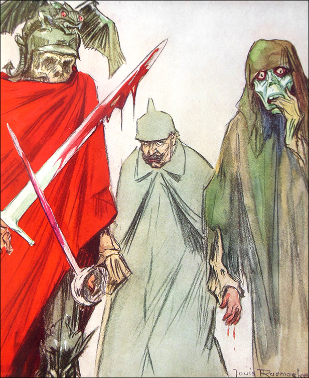 The Dutch political cartoonist Louis Raemaekers (1869-1956) was among World War I's greatest artists. His work initially appeared in the newspaper De Telegraaf, which was published in neutral Holland, but was quickly picked up by anti-German publications elsewhere. Shock appeal and vivid colors were a lot of what made his pictures so successful. According to one contemporary writer, "There is probably nothing that the Germans would not have paid, nothing that they would not have done, to have stopped Raemaekers' work." In fact, it is said that a bounty of 12,000 marks was placed on his head.