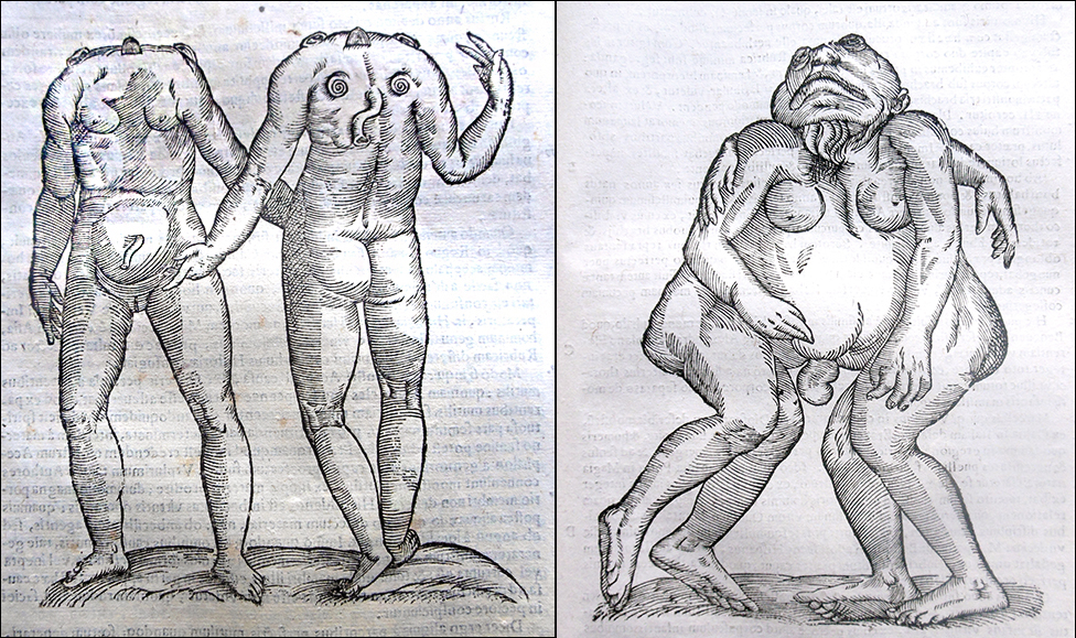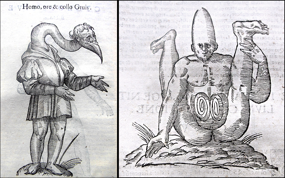 Many monsters, such as conjoined twins and creatures with extra limbs (or none at all), are based on naturally occurring birth defects, which were poorly understood at the time this book was written. Others are clearly exaggerations of real animals. It is easy to imagine that Aldrovandi's sea monsters, for example, evolved from stories told by sailors and fishermen. His book also contains very accurate images of the giraffe, which only a handful of Europeans had yet seen in the early 1600s. How did hearsay become scientific fact? Books like this help scholars and students answer that question.