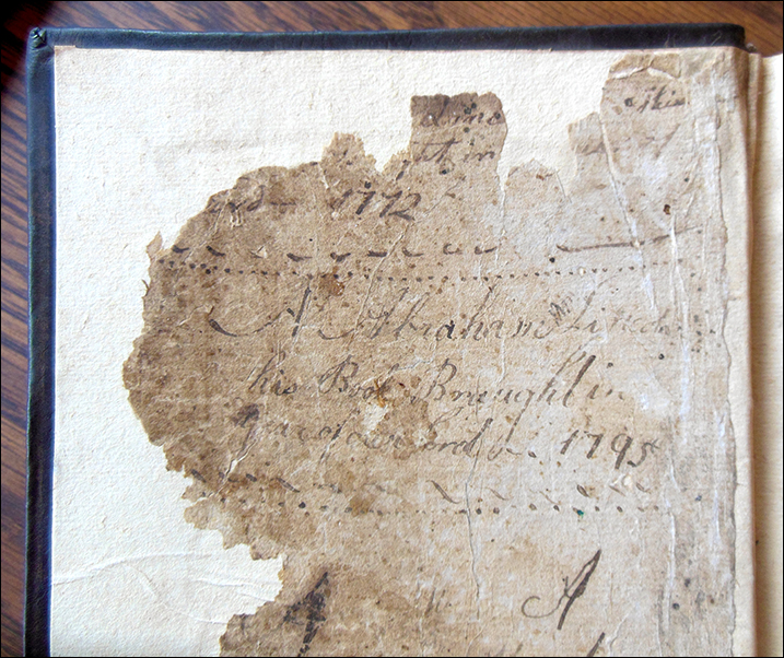 Most intriguing is the front endpaper. Though badly mutilated, it still bears the inscription "Abraham Lincoln, his book, brought [sic] in the year of our Lord 1795." Above this inscription is another that has almost disappeared due to paper loss, but the date 1772 is still visible, as well as the partial word "Linc—," presumably a sign that other Lincolns owned the book before Mordecai.