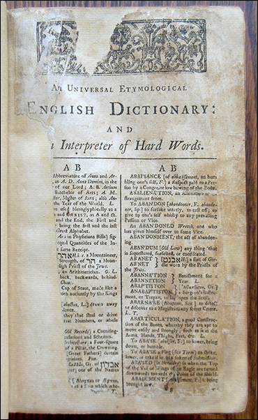 First published in 1721 and reissued many times over the next eighty years, Nathan Bailey's Universal Etymological English Dictionary was the most successful lexicon of its time. Though printed in London, copies would have been found throughout the English-speaking world. In the new state of Kentucky, Mordecai Lincoln, the future president's uncle and one of the most influential figures in his early life, owned a copy as early as 1792.