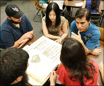 In the photo above, students are looking at a French gradual (sacred music book), printed in 1778, and discussing how it might have been used.