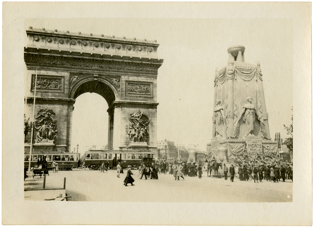 The Cenotaph was a temporary monument constructed for the Victory celebration held in Paris, July 14, 1919. A Victory Parade marking the end of the World War I marched past the Cenotaph and through the Arc de Triomphe on Bastille Day 1919.