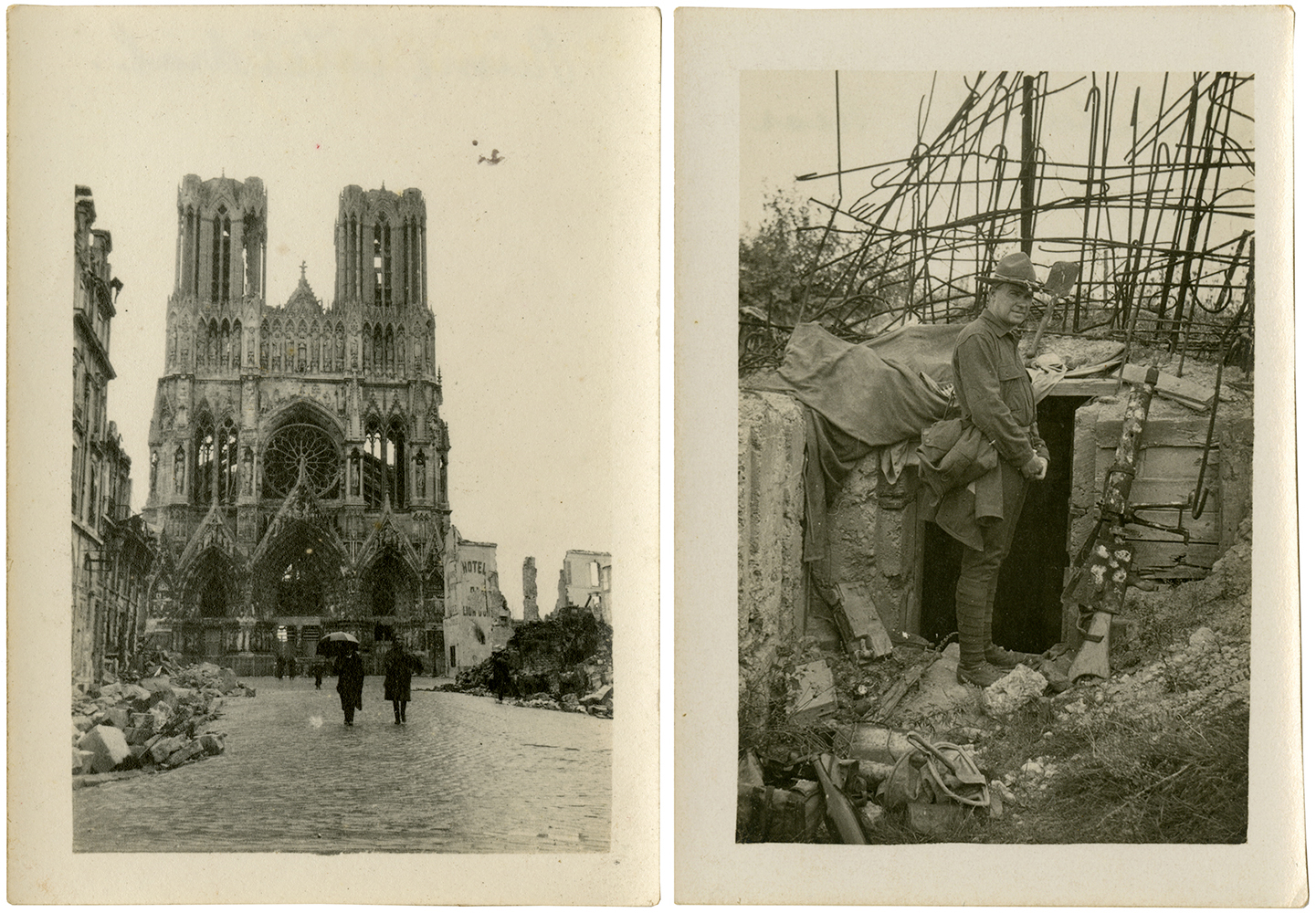 Marking the 100th anniversary of U.S. involvement in World War I, LSU Libraries Special Collections continues to highlight pertinent collections and materials. A large portion of the Oscar René Courrege papers consists of photographs and postcards pertaining to Courrege’s military service in France during 1918-1919. Groups of consecutive postcards make up letters written to his Aunt back home in New Iberia. These letters, dated between October 31 and December 27, 1918, provide a first-hand account of one Louisiana soldier’s experiences, observations and continued service overseas following World War I. The collection also contains about 90 black-and-white photographs mostly taken in post-World War I France, including Paris, Soissions, Crouy, Pinion, Anizy-le-Château, Vrigny and Reims. The identity of the photographer is unverified, but many of the photographs correspond to locations and situations described in Courrege’s letters. Photographic imagery includes post-war Paris, monuments for the Victory celebration on Bastille Day 1919, former battle sites, and war-ravaged towns left in ruin.