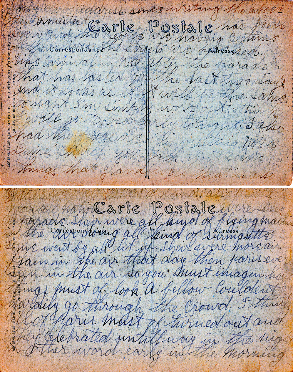 their were all kind of bands also pretty near all nations were in a parade. Their were all kind of flying machine in the air doing all kind of surmasette some went by all lit up. Their were more air plain in the air that day then paris ever seen in the air. So you must imagine how things must of look a fellow couldent hardily go through the crowd. I think all of paris must of turned out and they celebrated untill way in the night in other word early in the morning…”