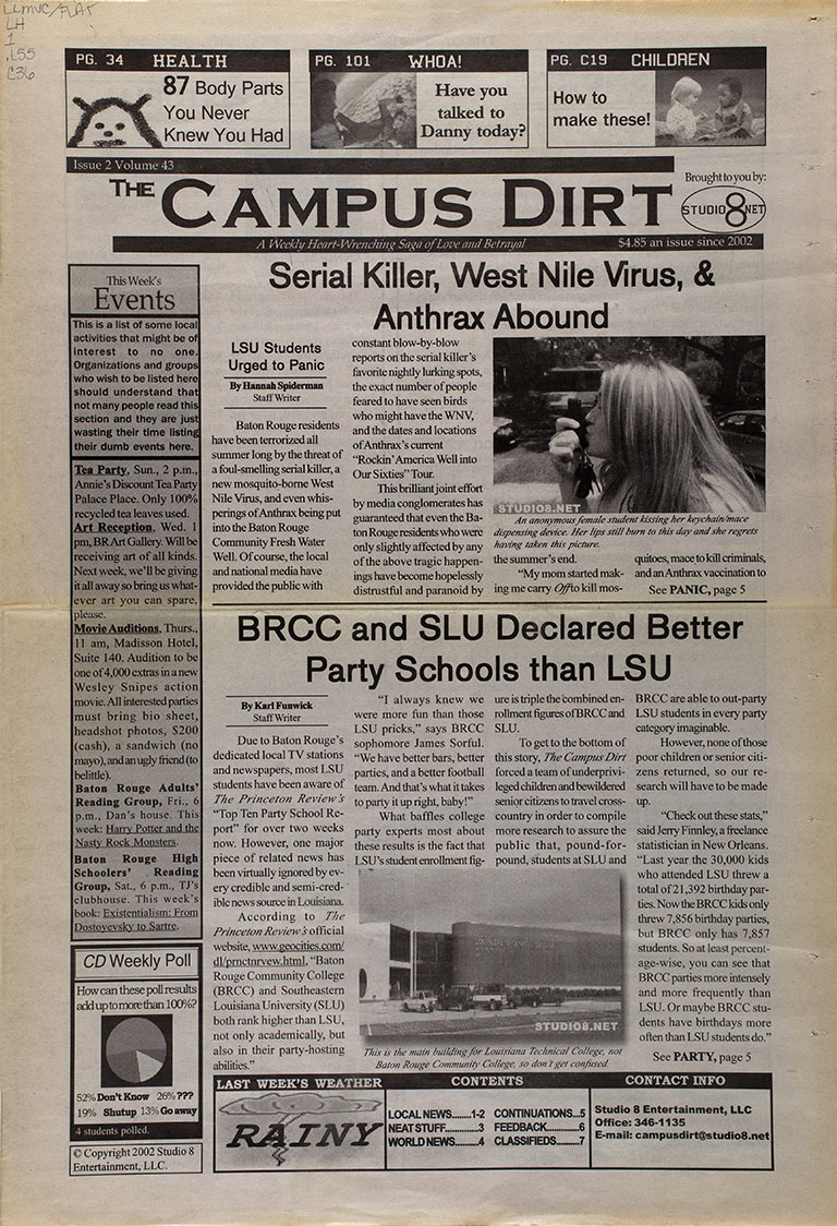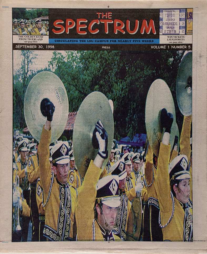 How can “15 everyday LSU students who have an interest in bringing intriguing and entertaining articles to the minds of students” not succeed? They can if their paper is largely indistinguishable from The Tiger-Weekly. Covering the same general campus news, features, opinions, entertainment, and sports shared by both its official and unofficial competitors, The Spectrum never quite found its niche in the university’s oversaturated print media market of the late 1990s. It held out for one academic year, almost always meeting its weekly deadline before fading away—but the back page pets were cute while they lasted.