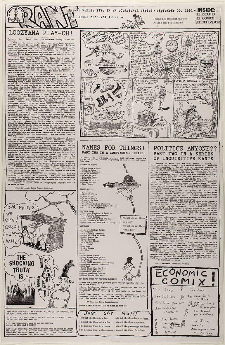 Just as the name implied, this series of eight 11” x 17” single-sided broadsides disseminated the strident opinions of Ethan Gilsdorf, a student in the English Department who apparently held sole responsibility for its content. Although evidently ruminating on such subjects as the First Iraq War, the Louisiana lottery, voter apathy, the rainforests, and Oliver Stone’s JFK, much of the content of Rant remained largely (and perhaps deliberately) perplexing, confounding, and entirely unfathomable to the post-collegiate intellect.