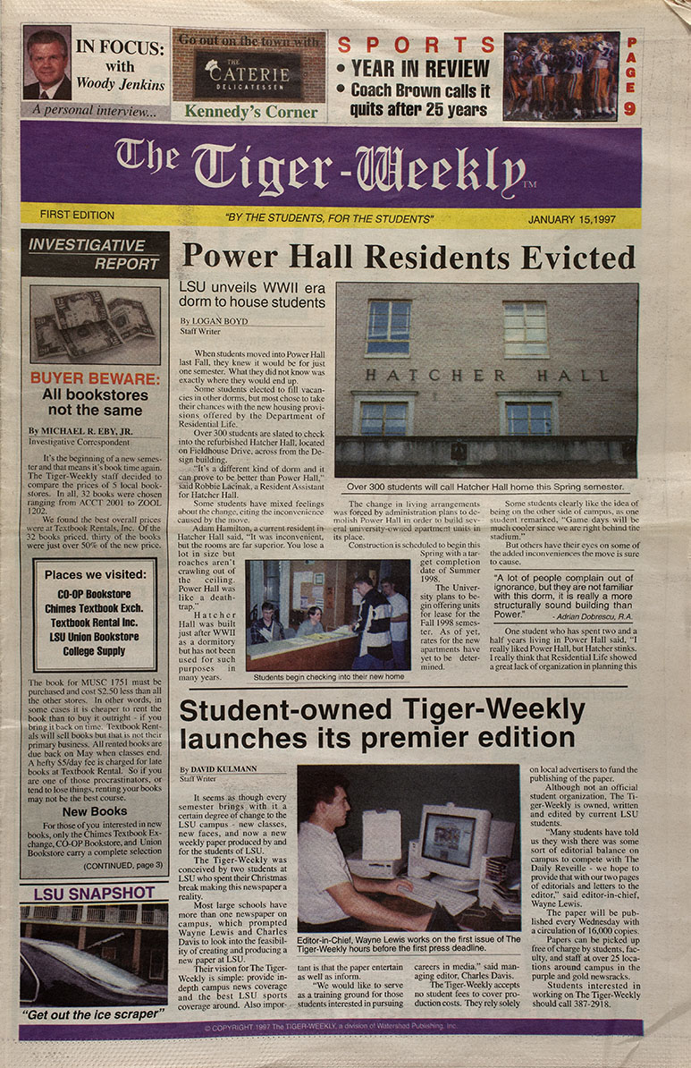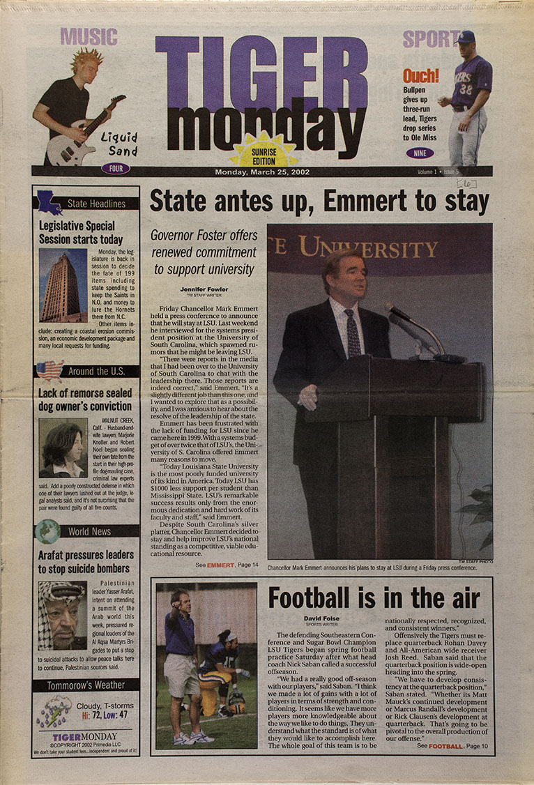 There once was a time when the Reveille didn’t publish an edition on Mondays—something about money, or maybe something else. I don’t know. Anyway, in the spring of 2002, Wayne T. Lewis, publisher of Tiger Weekly, launched Tiger Monday to fill the void. With a content little different from the university’s official daily, its only memorable accomplishment came in motivating the Reveille to return to a five-day publishing schedule in the fall semester. It’s work done, Tiger Monday published its final issue on August 26, 2002, the same day the Reveille returned to Mondays.
