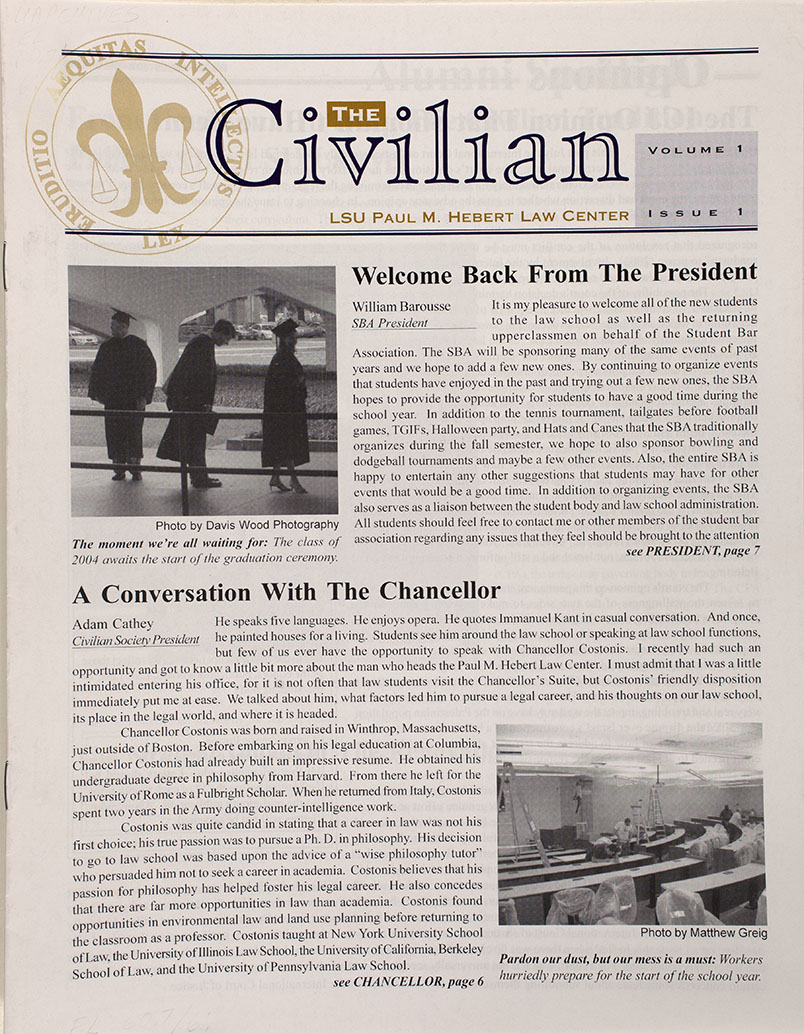 The LSU Student Bar Association gave a nod to Louisiana’s unique civil law tradition when it inaugurated The Civilian, the law school’s student newspaper, in 1970. Issued five or six times each year as a fully-fledged newspaper, it was filled with school news, interviews with professors, details of the moot court, examinations of bar exam passage rates, announcements of postgraduate employment, advice on interviewing with law firms, tension-relieving cartoons, and other accounts of life at the law school. It began to die down in the mid-1980s, ultimately defeating the news editor’s hopes “to revivify the lifeless corpse known as The Civilian” with better articles on legal theory and practice.