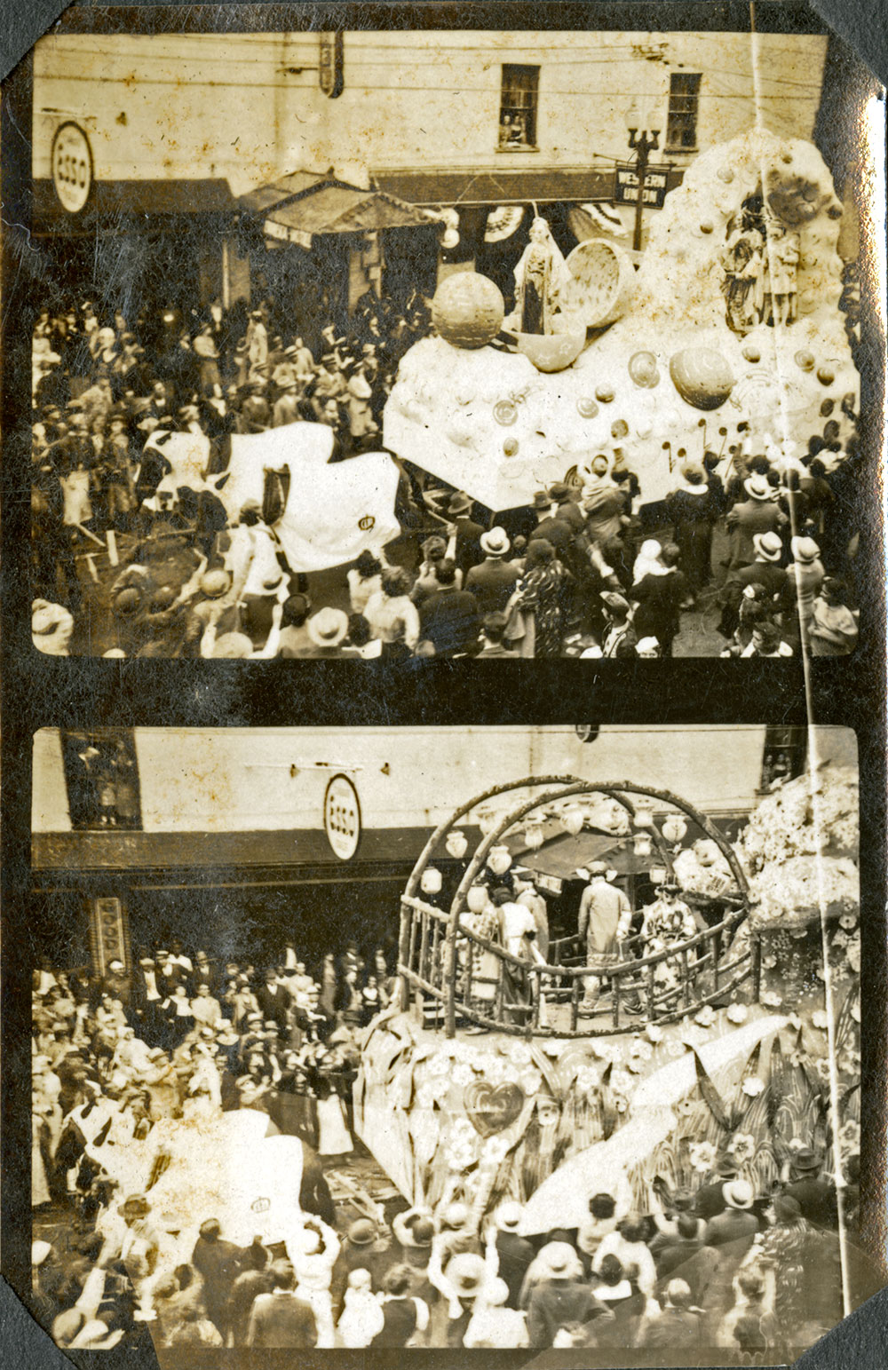 Rex Parade 1935. Floats designed by Léda Hincks Plauché. Float title top: "Where Nature Rested" [No. 20]; Float title bottom: "Where Love is Placed" [No. 19]. Date: March 5, 1935. Location: New Orleans, LA. St. Charles Avenue near the corner of Julia Street.