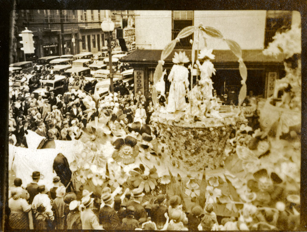 Rex Parade 1935. Floats designed by Léda Hincks Plauché. Float title: "Where Gay Flowers Come to Life" [No. 14]. Date: March 5, 1935. Location: New Orleans, LA. On the Corner of St. Charles Avenue and Julia Street.