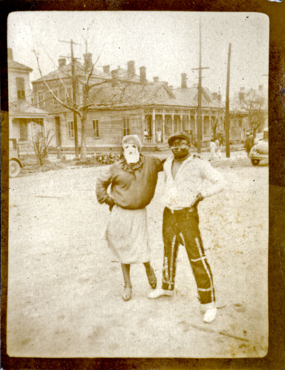 Two costumed revelers in the street on Mardi Gras Day in New Orleans.