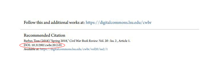 As a member of CrossRef, LSU Libraries is now assigning Digital Object Identifiers (DOIs) to the journal articles in the LSU Digital Commons as part of its journal publishing services offered to LSU faculty. What is a Direct Object Identifier? Direct Object Identifiers are similar to URLs. They are strings of numbers, letters and symbols forming persistent links to individual publications such as journal articles, books, chapters, and even preprints, video, audio and other formats. DOIs are persistent, so if an article's location on the internet changes, users will be redirected to its new URL. The DOI system is administered by the International DOI Foundation. Why are DOIs important? DOIs increase the reach and impact of research. They make citations more reliable, which is one way in which they enhance discovery. They are also a prerequisite for inclusion in DOAJ.org, the Directory of Open Access Journals, a resource used by libraries worldwide to provide access to ejournals through their online catalogs. Where can I find the DOI for an article? Each journal article in the LSU Digital Commons lists its DOI under "Recommended Citations" on the first page of the ejournal article.