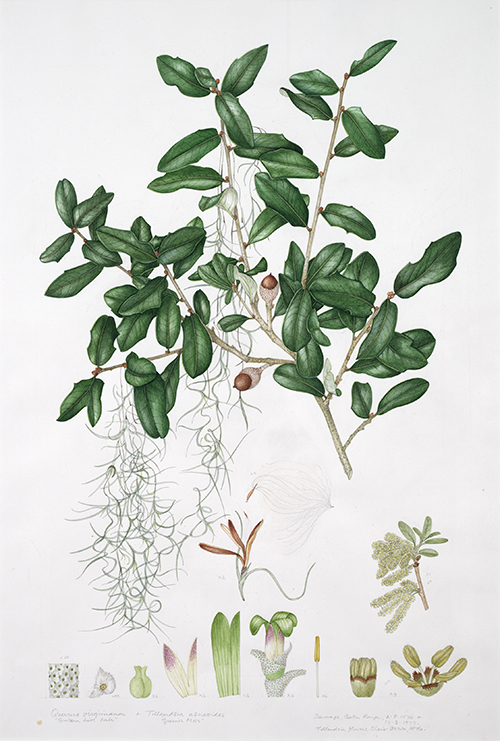 Quercus Virginiana, or the Southern Live Oak, from Native Flora of Louisiana." data-title="Quercus Virginiana, or the Southern Live Oak, from Native Flora of Louisiana."/> A statewide committee solicited sponsorship from individuals and corporations, and Lowell Urbatsch of LSU’s botany faculty became the project’s principal scientific advisor. Urbatsch coordinated the selection and collection of plant specimens from throughout Louisiana for Stones to draw, and these were subsequently deposited in the LSU Herbarium as a permanent scientific record of the project, complementing the beautiful drawings that entered the Libraries’ McIlhenny Collection. Since she worked only from live specimens Stones made regular trips to Baton Rouge each year and worked in a suite provided for her in the LSU Faculty Club. She often joined in local plant collecting excursions, making lasting friendships with some of the participants. The Louisiana flora project with Margaret Stones not only generated considerable public interest, but also expanded botanical knowledge by documenting a number of rare and endangered plants never illustrated before. In recognition of her outstanding work, LSU awarded Stones an honorary doctorate in 1986 and a University Medal in 1992. LSU Press first published the Stones drawings in book form in 1991, in Flora of Louisiana. Selected drawings from the Louisiana flora collection have been exhibited in Hill Memorial Library, as well as other venues in Louisiana. Some of Stones’ watercolors also have been loaned for exhibitions at the Smithsonian in Washington, DC, and to museums in England, Scotland, and Australia. The drawings in the Native Flora of Louisiana Collection are a marvelous record of the state’s natural heritage as well as an artistic treasure, which community groups, LSU visitors, and classes in botany, landscape architecture, and art are welcomed into Hill Memorial Library to view by appointment. In November 2018, LSU Press issued a much-anticipated full-color folio edition of the Stones watercolors under the title Native Flora of Louisiana. Margaret Stones received a copy of the new book before her death, and was able to enjoy revisiting those ten happiest years of her life during which she worked on the Louisiana drawings. It was surely a gratifying end to her long and amazing journey. There is a sampling of Ms. Stones’ work for display in the Hill Memorial Library’s lecture hall in commemoration of her passing. Please stop by to see a small part of her legacy and remember her full and productive life. The exhibition will run through the end of February 2019.
