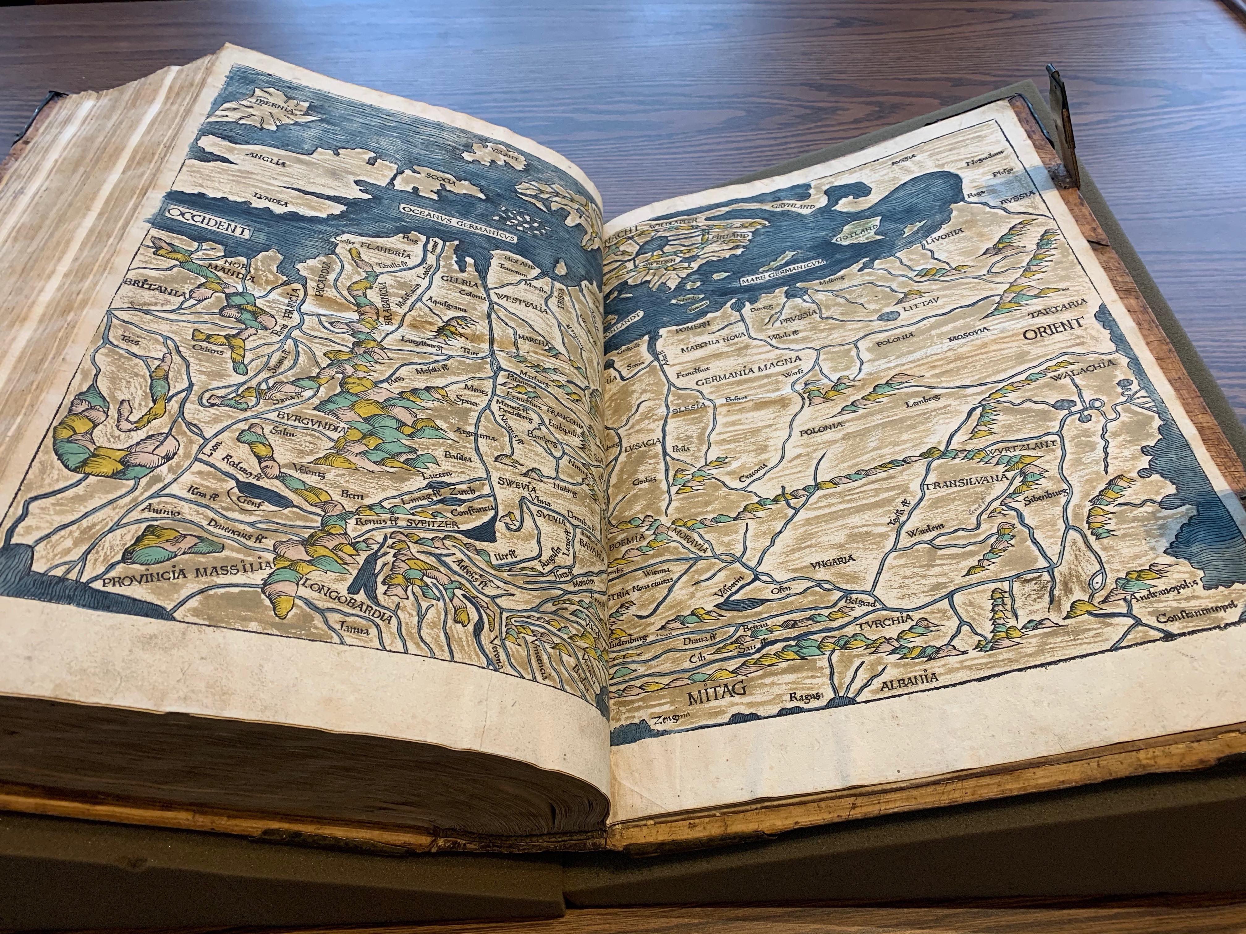 It’s taken this copy of the Nuremberg Chronicle five hundred years to make it to Baton Rouge, but now that it’s here it is eager to make its debut on the bayou. Once the book has been carefully cataloged and housed, it will be available for any patrons in our reading room – come for the woodblock maps and whimsical illustrations, stay for the impressive medieval binding!