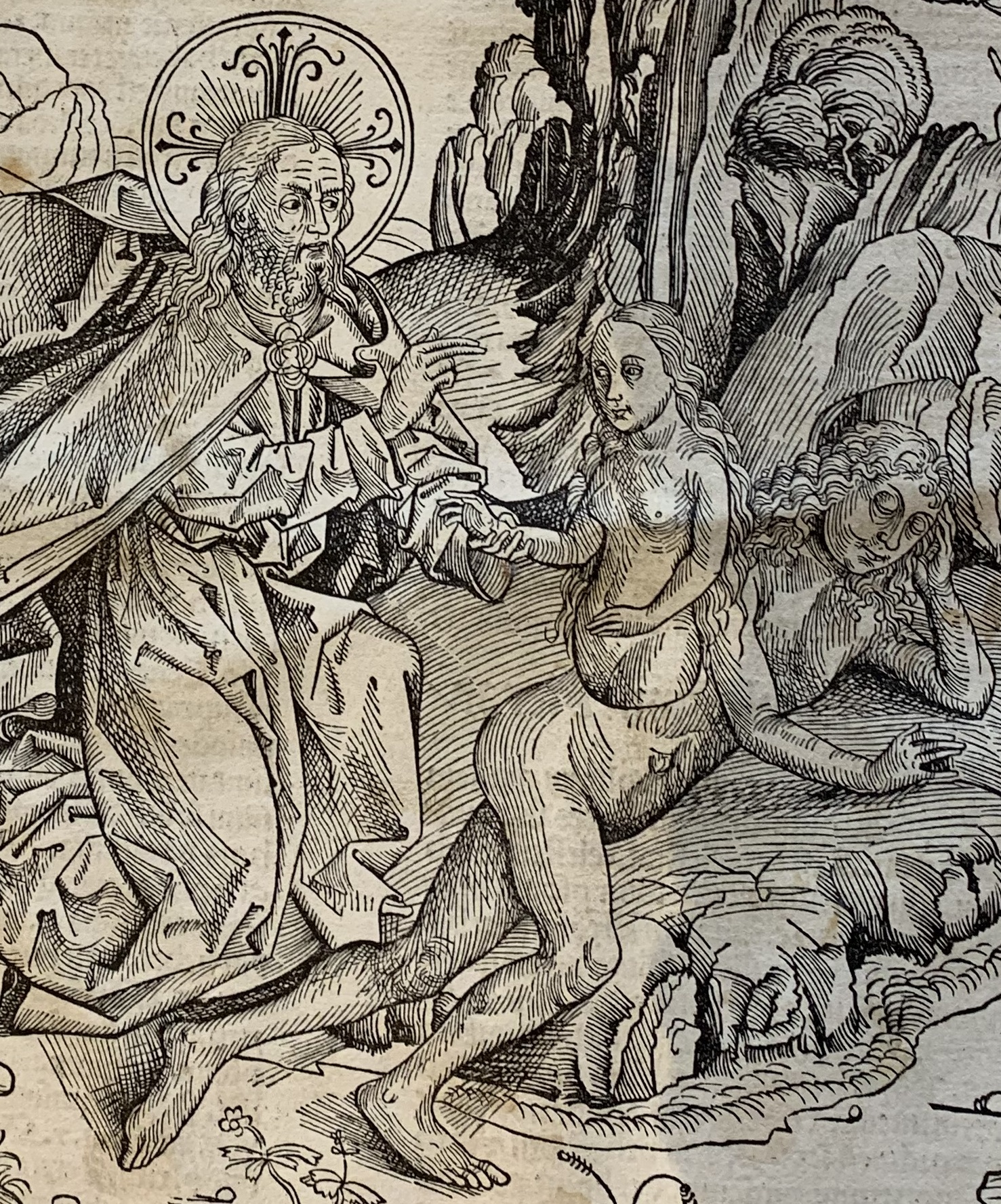 Koberger was the project’s technician, but the woodcut illustrations – the book’s hallmark – were the product of the workshop of Michael Wolgemut, Nuremberg’s leading artist. Wolgemut had in his employ the young Albrecht Dürer, Koberger’s godson, who later established himself as one of the most important figures of the Northern Renaissance of the 16thcentury. The book’s 1,800 illustrations bear scrutiny not only for evidence of Dürer’s humanist hand, lighter and more skilled than that his medieval predecessors, but also because of their economy: roughly 6-700 woodblocks were used throughout the book, meaning that individual blocks were used on average more than three times. Historical and mythical figures were interchanged for one another, some cityscapes stand in for others unchanged, and depictions of church councils are almost gleefully repeated (as if to say that if you’ve seen one committee meeting, you’ve seen ‘em all).