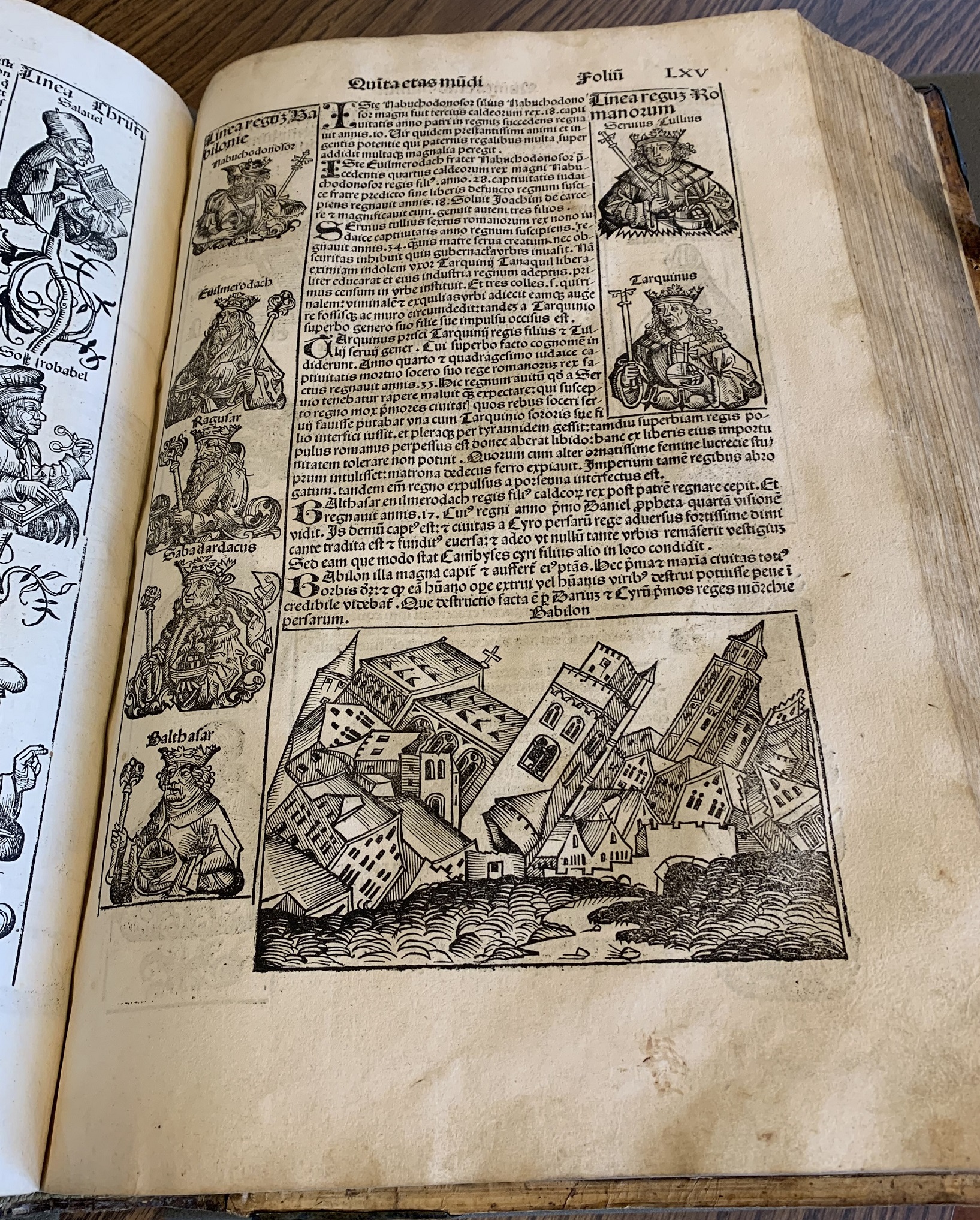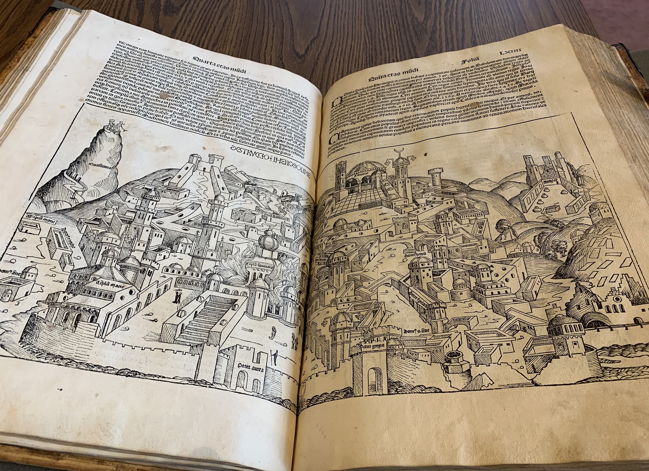 While LSU Football was winding its way through a successful 2020 postseason, Special Collections was enjoying a big win of its own, adding a copy of the large, impressive Nuremberg Chronicle to our rare book collections. Published in 1493 in the German city that gives it its common name, this book represents the height of fifteenth-century book illustration and design. Incorporating over 1800 woodblock illustrations of people, biblical scenes, maps, and cityscapes, it is arguably second in importance only to the Gutenberg Bible in the pantheon of early European printing.