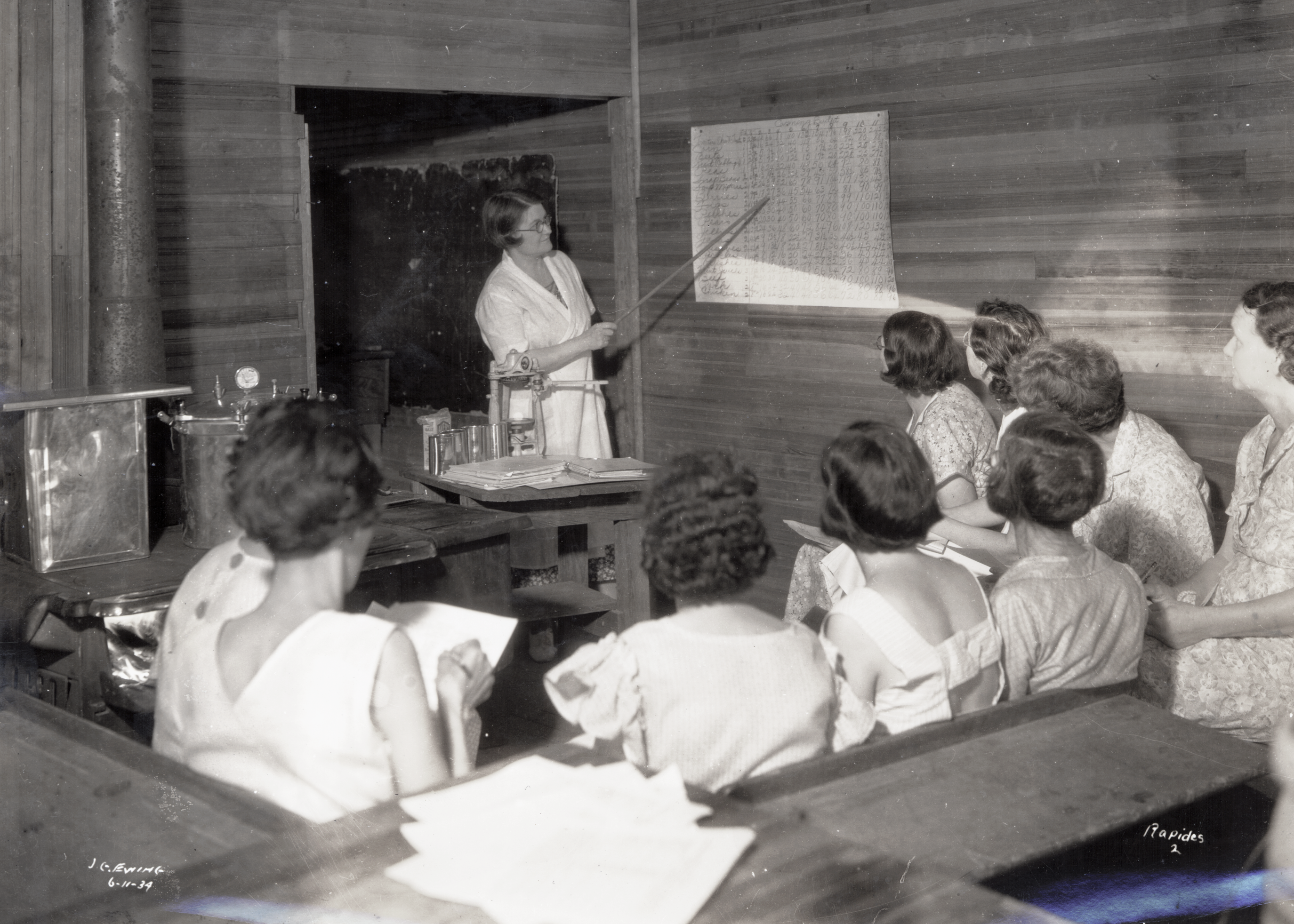 Dorothy Howell: You were taught home furnishings, different periods of furniture, how you could judge when a piece of furniture was a good piece or not. We were taught how to read blueprints and we even had to make a blueprint because it was assumed that you would build your house someday, and so you had to be able to work with the architect. We had a course in home nursing because, as a mother, you would have to take care of your children. We had a course in clothing construction and food preparation, the main things you did. And so you could either teach these things as a home ec teacher or you could do them at home. That's close to all the opportunities there were in home economics. And then out of that grew a lot of experimental kitchens and a real time in the United States when it was really a big deal to . . . [flipping pages] Here's some pictures of a Betty Crocker home economics kitchen with the home economist in it. And see, you could be trained to do these consumer services, too. So you were trained in how to give demonstrations. We were the Julia Childs of the day and made all the demonstrations.