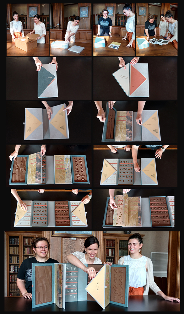 Book artist Julie Chen’s new work, Wayfinding, has found its way to Hill Memorial Library! This beautiful book is now on display in the exhibition “Exploding the Codex: Book Arts in Special Collections.” Chen’s work is focused on the physical nature of the book and the sensory experience involved in the act of reading. For example, the paper used in the construction of Wayfinding produces a distinctive sound when pages are turned. The artist will present "Every Moment of a Book" as part of the Alfred C. Glassell, Jr. Endowed Lecture Series at the LSU College of Art & Design at 5 pm on Thursday, October 24, 2019, in the LSU Design Building Auditorium (Rm. 103). Learn more about her work by visiting flyingfishpress.com. Caroline Ziegler, Madeline Conrad, and Madelaine Kobe of LSU Libraries Special Collections demonstrate how Wayfinding works in the composite image shown here. Visit “Exploding the Codex: Book Arts in Special Collections” through December 13, 2019.